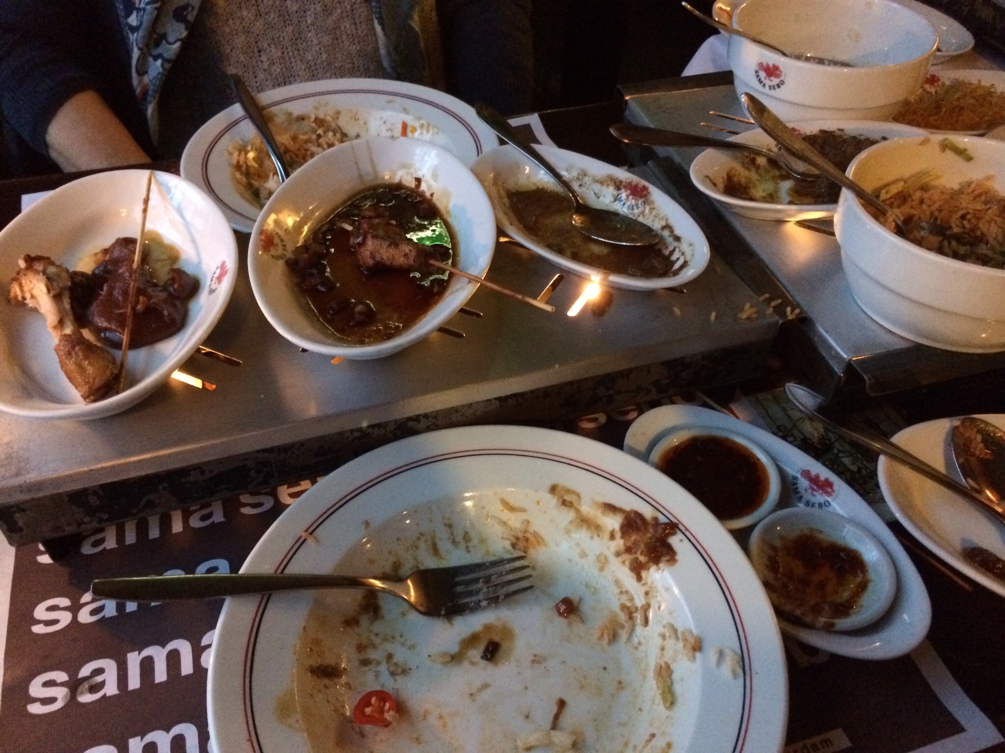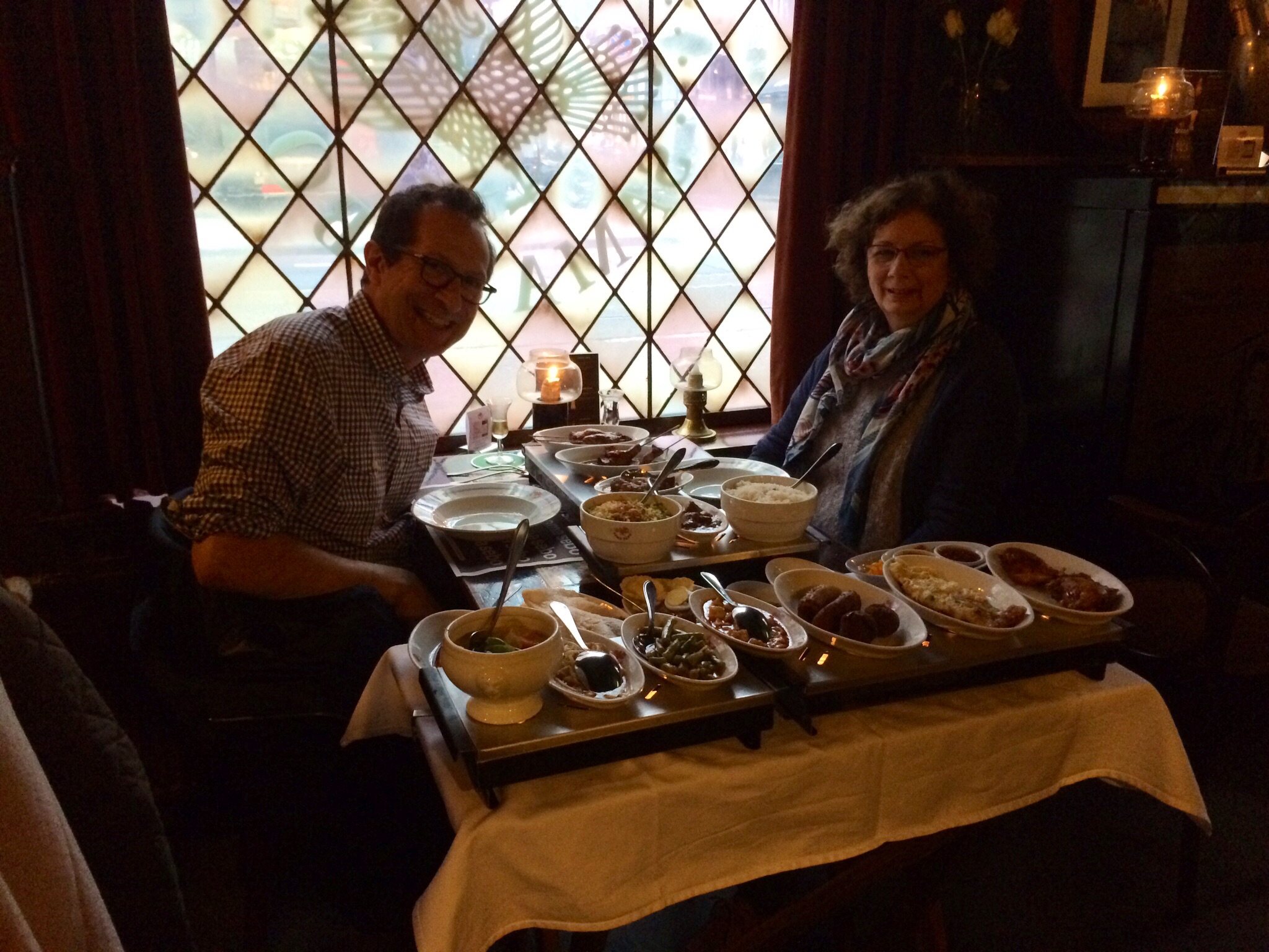 We ate at an Indonesian restaurant just a short way from the Rijksmuseum. It used to be a “brown cafe” (a cafe with walls turned brown by cigarette smoke, now illegal indoors) called The Posthoorn. Now it’s Sama Sebo. We both ordered the rijstafel, which translates as rice table. There are seventeen small portions, and they were delicious!