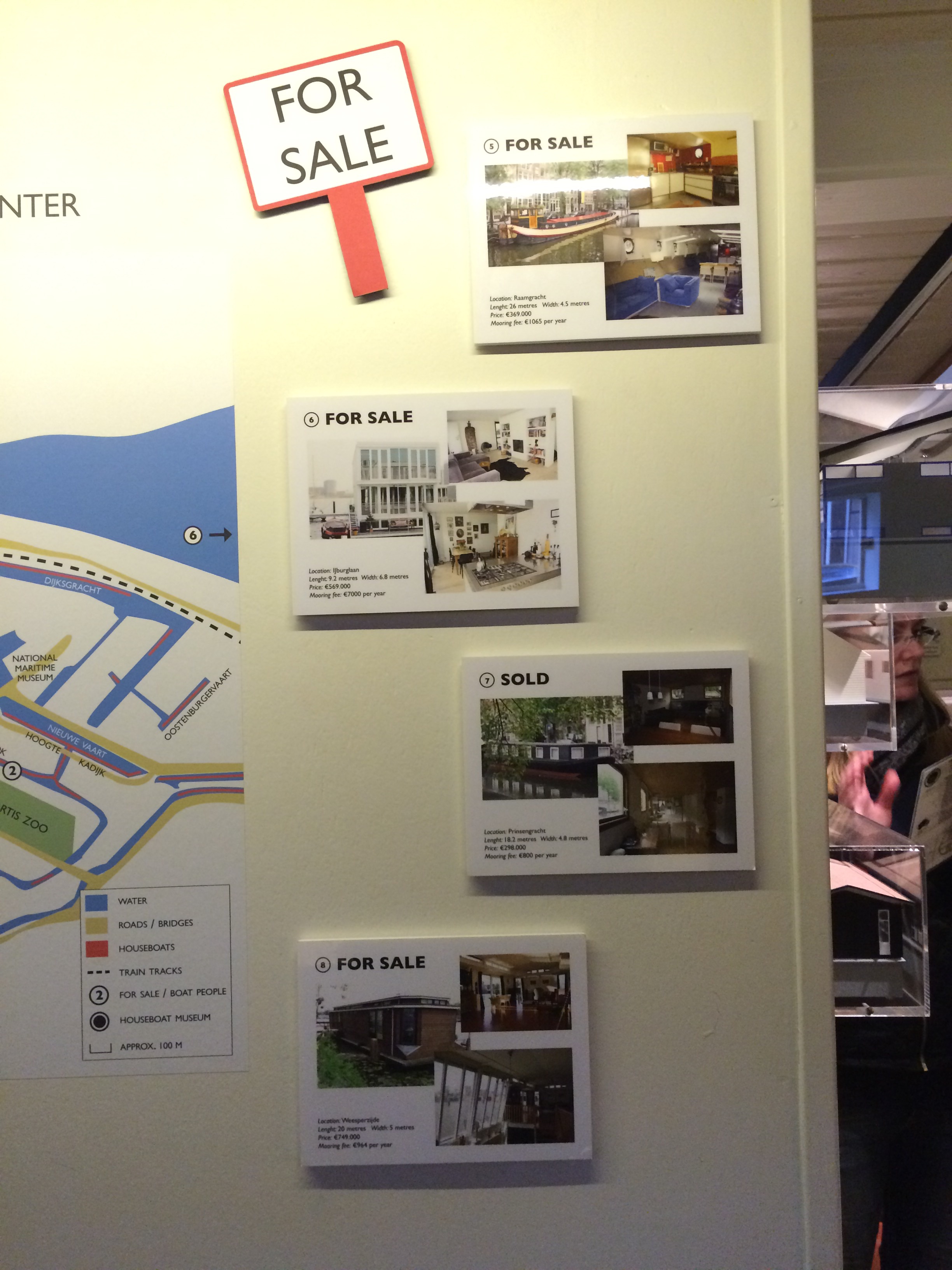 Houseboat living started in the ’40s, when there was a housing shortage. It went on unregulated until the ’60s, when it completely took off. Now there are no free moorings. If you want to live on a houseboat, you have to buy an existing boat, which comes with a mooring. If you want a different boat, that’s fine, but you have to buy the boat that comes with the mooring and then replace it. As you can see in the houseboats-for-sale listings pictured below, each sale comes with an annual mooring fee. The mooring fees and the prices of the boats vary according to neighborhood.